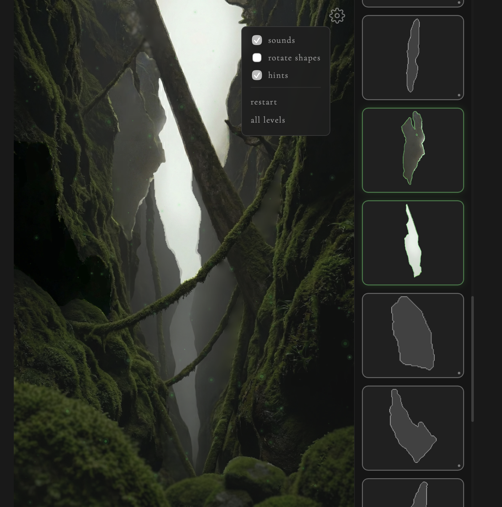 Each scene hides voids — negative spaces between objects. Match them with contour cards. When all voids are revealed — the world comes alive.
